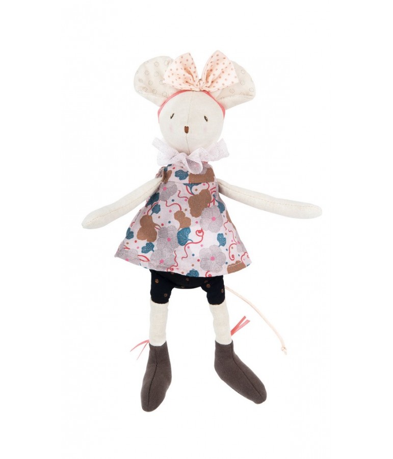 Il était une fois…une petite souris Lala! Un soupçon magicienne, malicieuse et coquette. Elle est confectionnée en toile chambray, coiffée d'un nœud et porte une tunique imprimée fleurs avec une collerette de tulle et des bottines en jersey.